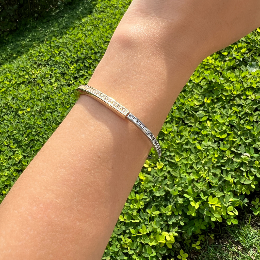 - Design Inspirado: Bracelete em formato de cadeado, com mix de banhos em ouro 18K e Ródio Branco, cravejado com zircônia branca. Este design está super em alta, proporcionando um visual moderno e sofisticado.